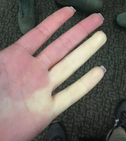 Синдром Рейно сопровождается последовательным изменением окраски пальцев рук (бледный-синий-красный), похолоданием, онемением, чувством мурашек и иногда болями в кистях рук. Помимо конечностей аналогичные проявления могут отмечаться в области кончика носа, подбородка, мочек ушей и языка. Продолжительность приступа обычно составляет 15-20 минут.