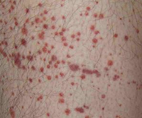 - Геморрагический диатез петехиально-пятнистого типа (мелкоточечные геморрагические высыпания <2 см в диаметре на коже и слизистых). Они могут впервые появиться при ушибах, в местах трения одежды о кожу или вследствие проводимых инъекций. Типично расположение геморрагических высыпаний на нижних конечностях и передней поверхности брюшной стенки.