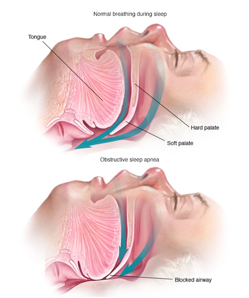 Обструктивные апноэ во сне. Данный тип нарушения возникает вследствие сужения (обструкции) верхних дыхательных путей. Это самый частый тип апноэ. Во время сна расслабляется мускулатура тела, в том числе мускулатура глотки и мягкого неба, что приводит к западению корня языка и закупорке верхних дыхательных путей. В то же время диафрагма продолжает получать от мозга «дыхательные» импульсы и, вследствие этого, интенсивно сокращаться. При этом возникает отрицательное давление в дыхательных путях, что приводит к спадению дыхательных путей и их закупорке.